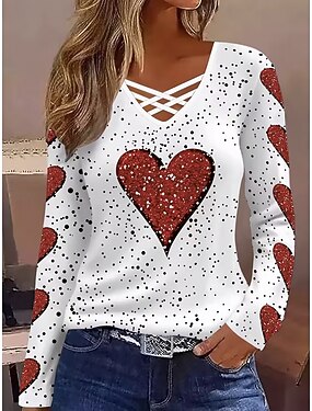 バレンタイン・デー 女性用 Tシャツ 切り抜き プリント ハート グラフィック ヴィンテージ スタイリッシュ クラシック 長袖 Vネック レギュラートップス 日常 ホワイト 春 秋
