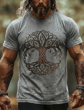バイキング生命の樹Tシャツ メンズ ユグドラシル 北欧ルーン文字 グラフィック ウォッシュドコットンブレンドTシャツ ヴィンテージ グレー レトロ トップス 衣類 アパレル S M L XL XXL XXXL