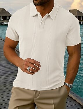 男性用 ポロシャツ テクスチャード加工 カジュアル ストリート ラペル 半袖 ベーシック 近代の 平織り 縞柄 ボタン ニット 夏 春 レギュラー ブラック ホワイト バーガンディー ライト アプリコット ライトブルー ポロシャツ