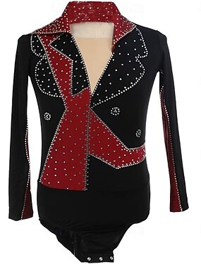フィギュアスケート用トップス 男性用 アイススケート トップス レッド パッチワーク オープンバック 伸縮性あり 訓練 競技大会 スケートウェア クラシック クリスタル・ラインストーン 長袖 アイススケート フィギュアスケート