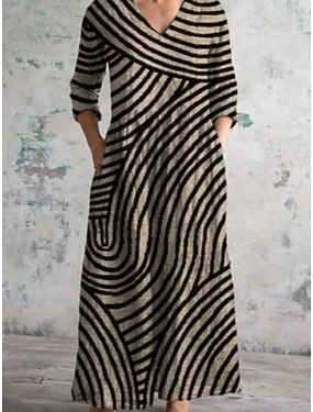 女性用 マキシドレス A ラインドレス カジュアル 日常 レギュラー フラワー 七分袖 Vネック ブルー グリーン アプリコット ベージュ 夏 春 秋