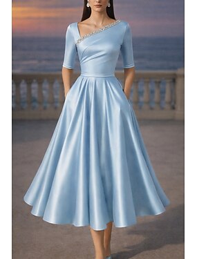 Aライン セミロング丈 カクテルドレス エレガント セミフォーマルドレス ハーフスリーブ Vネック ガーデンパーティー 結婚式 ポケット ストレッチサテン とともに ラインストーン プリーツ ビーズ