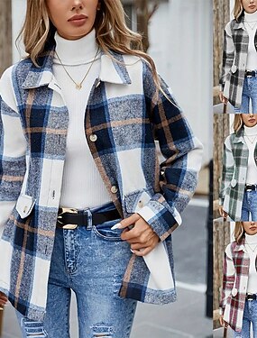 女性用 シャツジャケット カジュアルジャケット 快適 高通気性 ポケット ボタン プリント カジュアル チェック バケーション ストリート カジュアル デイリーウェア シングルブレスト レギュラー 折襟 レギュラー 長袖 アウターウェア ブルー ルビーレッド グリーン 春 秋