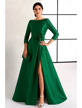 Aライン フロア丈 イブニングドレス ボールガウン フォーマルドレス エレガント 高分割 シルキー 長袖 クルーネック 結婚式 フォーマル ポケット サテン とともに プリーツ ポケット