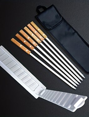 ステンレス製バーベキュー串6本+肉押し型1個、木製ハンドル付きロングハンドルカバブ串、屋外グリル用バーベキューグリルアクセサリー、キッチン用品