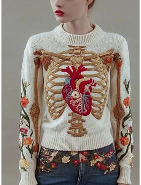 ウィメンズ セーター スケルトン キュート ストリートウェア カジュアル グラフィック スケルトン クルーネック パッチワーク ニット 長袖 レギュラー トップス ニットレッド ベージュ 秋 冬