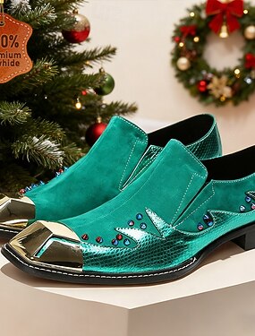 装飾的なスタッドとゴールドのつま先キャップが付いたメンズグリーンレザーローファー - クリスマスのお祝いや冬のイベントにぴったりのユニークで華やかな靴