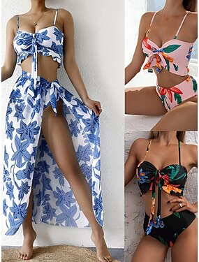女性用 スイムウェア ビキニ スリーピース ブリーフ 水着 フリル 旅行度假风 ビーチウェア フラワー グラフィック Vネック ノースリーブ 水着