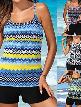 女性用 レギュラー ラッシュガード 花柄水着 タンキニ水着 幾何学模様 抽象的 カラーブロッキング 2個 取り外し式パッド ボイレグ UVサンプロテクション UPF50+ 弾性ある ノースリーブ サーフィン カヌー ウォータースポーツ 夏