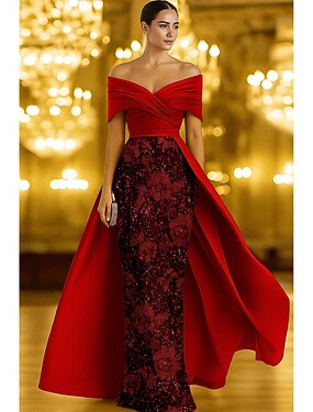タイト/コラム フロア丈 ビーズ刺繍 フォーマルドレス 花嫁の母のドレス イブニングドレス オーバースカート付きボールガウン フォーマルドレス エレガント きらびやかな シルキー 半袖 オフショルダー 結婚式 フォーマル 取り外し可 サテン レース とともに グリッター素材 ビーズ スパンコール
