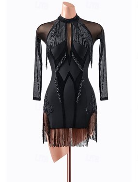 女性用のエレガントな黒のラテンダンスドレス - メッシュのロングスリーブ、モックネック、フリンジ付きビーズのボディス &複雑なアクセントのルンバ、サルサ、タンゴのガウン