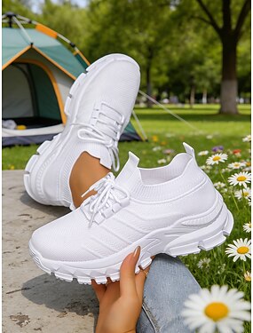 チャンキーソールとストレッチフィットを備えたレディースホワイトニットスリッポンスニーカー。普段履き、ウォーキング、旅行、ショッピング、アウトドアアクティビティに最適な快適なカジュアルシューズ。