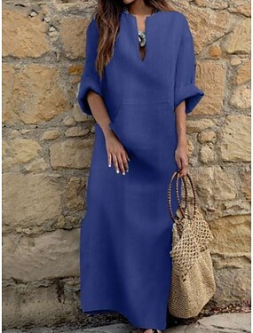 女性用 マキシドレス フェイクコットンリネン シフトドレス カフタンドレス ビーチドレス ファッション 近代の アウトドア バケーション お出かけ レギュラー 平織り 長袖 クルーネック ブルー ライトブルー 夏 春