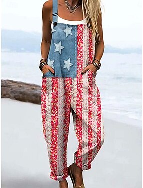 アメリカ独立記念日 レディース オーバーオール アクティブ グラフィック ノースリーブ ストレート スクエアネック パッチワーク ポケット デイリー ビーチ ルーズフィット ブルー レッド 夏