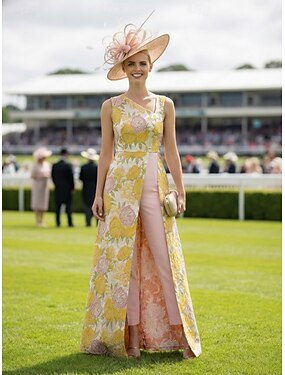 ジャンプスーツ Aライン フロア丈 ダービードレス マダムドS ノースリーブ Vネック エレガント ヴィンテージ フォーマル 結婚式のゲスト ケンタッキーダービー ジャカード 〜と フラワープリント
