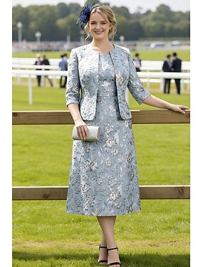 ツーピース Aライン セミロング丈 ウェディングゲストドレス マダムドS ノースリーブ 七分袖 クルーネック スクエアネック エレガント シンプル フォーマル ケンタッキーダービー セミフォーマル ジャカード ショートジャケットドレス 〜と 刺繍 アップリケ カスケーディングラッフル
