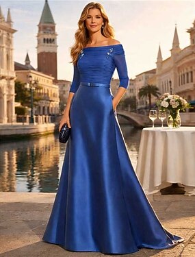 Aライン コートトレーン ウェディングゲストドレス フォーマルドレス イブニングガウン マダムドS ストラップ オフショルダー エレガント フォーマル 結婚式のゲスト 婚約パーティー サテン 〜と フラワー