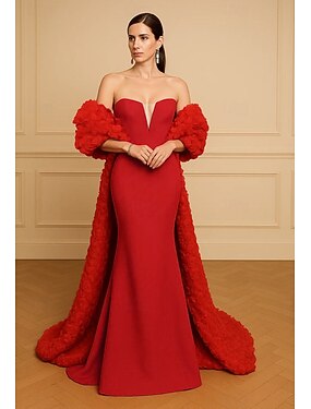 タイト/コラム ドレス フロア丈 ウェディングゲストドレス フォーマルドレス イブニングガウン マダムドS ノースリーブ オフショルダー エレガント シンプル ミニマリスト フォーマル レース 〜と 3Dフラワー 刺繍