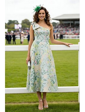 Aライン アンクル丈 パーティードレス 二次会ドレス / カクテルドレス ダービードレス マダムドS 半袖 Vネック エレガント ヴィンテージ 結婚式のゲスト ウェディングパーティー ケンタッキーダービー サテン 〜と フラワー