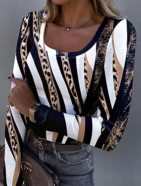 女性用 チュニック プリント グラフィック レオパード 抽象的 ヴィンテージ ファッション スタイリッシュ 長袖 スクエアネック レギュラートップス 日常 ブルー パープル グリーン カーキ色 春 秋