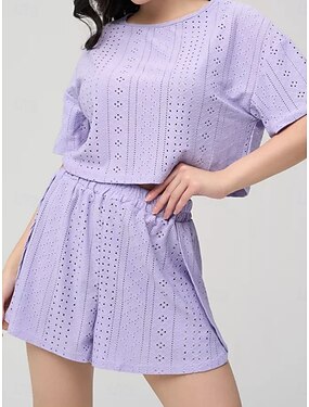 女性用 パジャマセット カジュアル コンフォートシューズ ピュアカラー 弾性ウエスト ホール ショーツ 日常 家 半袖 クルーネック ブルー ブラック ホワイト ピンク パープル 夏 春 ルーズフィット