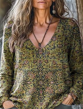 女性用 ボヘミアンシャツ ブラウス フリル フラワー グラフィック エレガント ヴィンテージ スタイリッシュ 長袖 Vネック レギュラートップス 日常 祝日 お出かけ ブルー ワイン アーミーグリーン ルビーレッド ライトパープル 春 秋