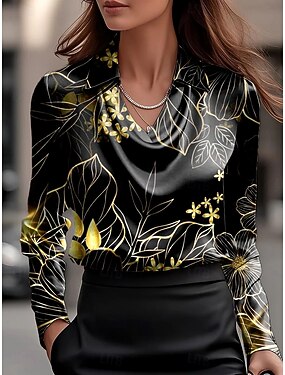 女性用 シャツ フリル ドレープ オンブル’ フラワー グラフィック エレガント スタイリッシュ ベーシック 長袖 カウルネック レギュラートップス 日常 ワーク パーティーイブニングウェア ブラック ホワイト ネイビーブルー 秋 冬