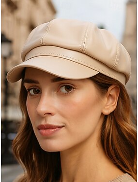 女性用フェイクレザーニュースボーイキャップ、ヴィンテージ八角形ベイカーボーイハット、秋冬用ファッションレトロストリートウェアアクセサリー