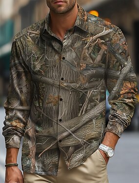 男性用 カモフラージュ シャツ ボタンアップシャツ 長袖 ヴィンテージレトロ アウトドア キャンピング&ハイキング ハンティング 春 秋 折襟 3Dプリント 襟付きシャツ グレー