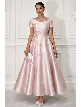 Aライン アンクル丈 カクテルドレス エレガント フローラル 半袖 ボートネック パーティー 結婚式 ピンクのドレス サテン とともに 刺繍の花 プリーツ アップリケ