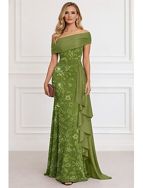 Aライン フロア丈 卒業ドレス イブニングドレス ボールガウン フォーマルドレス エレガント きらびやかな 半袖 オフショルダー 結婚式 フォーマル スパンコール とともに グリッター素材 プリーツ