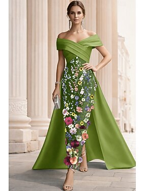 Aライン タイト/コラム フロア丈 イブニングドレス オーバースカート付きボールガウン フォーマルドレス エレガント カラーブロック 高分割 半袖 オフショルダー 結婚式 フォーマル サテン スパンコール とともに グリッター素材 刺繍