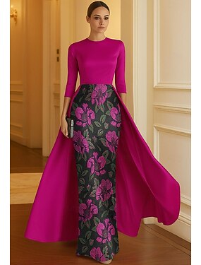 タイト/コラム フロア丈 カクテルドレス エレガント ヴィンテージ フローラル 半袖 クルーネック 結婚式 フォーマル ピンクのドレス オーガンザ ストレッチクレープ とともに ラッフル