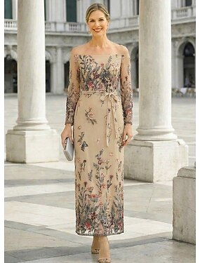タイト/コラム アンクル丈 カクテルドレス エレガント ヴィンテージ フローラル 長袖 オフショルダー ガーデンパーティー 結婚式 サテン チュール とともに 刺繍の花 リボン 刺繍