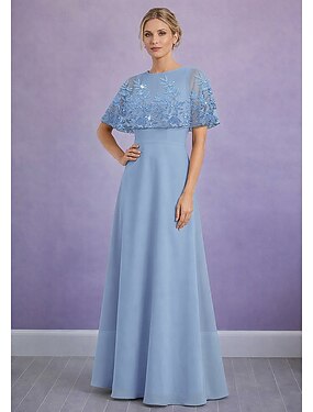 Aライン ドレス フロア丈 ウェディングゲストドレス フォーマルドレス イブニングガウン マダムドS 半袖 クルーネック エレガント シンプル カジュアル フォーマル シフォン ショール 〜と ビーズ アップリケ