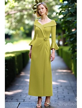ツーピース Aライン ドレススーツ アンクル丈 ウェディングゲストドレス マダムドS 長袖 クルーネック エレガント フォーマル 結婚式のゲスト シフォン レース 〜と ソリッドカラー
