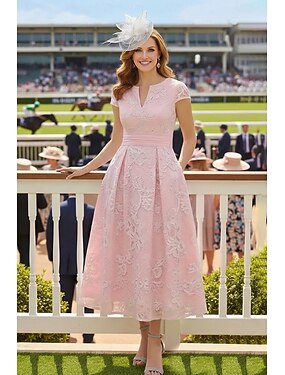 Aライン ドレス アンクル丈 二次会ドレス / カクテルドレス ウェディングゲストドレス マダムドS 半袖 Vネック ボートネック エレガント カジュアル フォーマル 〜と 刺繍 アップリケ