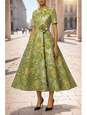 Aライン セミロング丈 カクテルドレス エレガント フローラル 半袖 クルーネック ガーデンパーティー 結婚式 ポケット ジャカード カウルバック とともに フラワープリント 刺繍の花 プリーツ