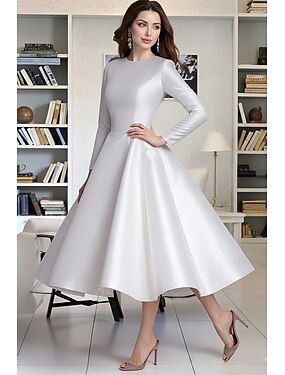 Aライン セミロング丈 サテンドレス パーティードレス 二次会ドレス / カクテルドレス マダムドS 長袖 クルーネック エレガント シンプル ファミリーパーティー 誕生日 サテン 〜と ソリッドカラー