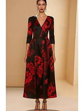 Aライン セミロング丈 パーティードレス 二次会ドレス / カクテルドレス ウェディングゲストドレス マダムドS 七分袖 Vネック エレガント ガーデンパーティー 結婚式 フォーマル サテン 〜と フラワープリント
