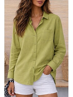 女性用 シャツ サマーシャツ ボタンアップシャツ コットンシャツ パッチワーク ポケット 純色 平織り 旅行度假风 ファッション カジュアル 長袖 折襟 レギュラートップス 日常 ビーチ 祝日 リーフグリーン 夏 春 秋 冬