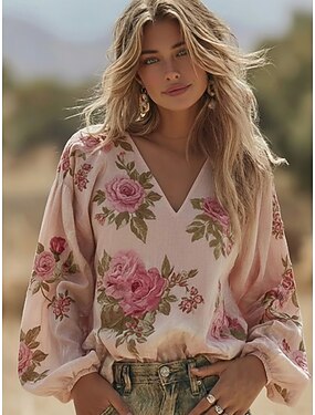 ウィメンズ ボヘミアン ブラウス リネン風 通気性 軽量 フローラル グラフィック エレガント ボヘミア ヴィンテージ ロングスリーブ Vネック レギュラートップス デイリー ホリデー パッチワーク ボタン プリント ピンク サマー スプリング