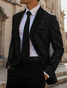 男性用 ブレザー ビジネス カクテルパーティー ウェディングパーティー ファッション カジュアル 春 秋 ポリエステル 平織り ポケット グリッター素材 快適 シングルブレスト ブレザー ブラック