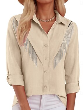 女性用 ドレスシャツ ボタンアップシャツ ブラウス グリッター素材 ボタン ラインストーン エレガント スタイリッシュ クラシック 長袖 折襟 レギュラートップス 日常 祝日 お出かけ ブルー ブラック ライトグリーン ピンク ワイン 夏 春