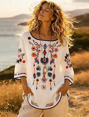 女性用 シャツ ブラウス フェイクコットンリネン フリル 刺繍 プリント フラワー ヴィンテージ スタイリッシュ ハーフスリーブ クルーネック ロングトップス 日常 祝日 お出かけ ホワイト ネイビーブルー 夏 春