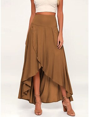 女性用 ファッション カジュアル マキシ ハイウエスト スカート 平織り ラッフル マイクロエラスティック 日常 ストリート ワイン ブラック ピンク ブラウン 春 ポリエステル