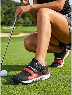 調節可能なバックルストラップ付きの女性用グリーンスパイクゴルフシューズ、トレーニングやウォーキング用の取り外し可能なスパイク付きの通気性のある軽量ゴルフスニーカー &アウトドアスポーツ