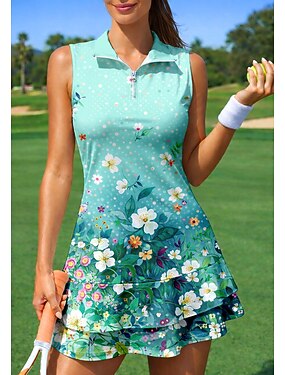 女性用 勾配 花 スポーツドレス テニスポロドレス ノースリーブ ジッパー クォータージップ 弾性ある モイスチャーコントロール 高通気性 バレーボール テニス ゴルフ カラー 折襟 ショートパンツ ドレス グリーン テニスウェア