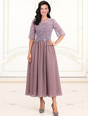 Aライン膝下丈パーティードレスカクテルドレス結婚式ゲストドレス母親のためのドレス半袖クルーネックエレガントフォーマルアップリケ付き