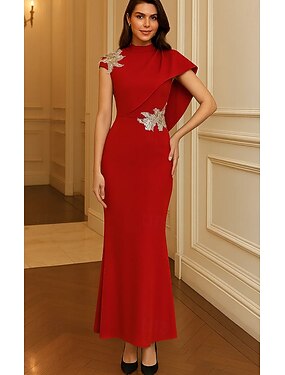 トランペット/マーメイド タイト/コラム フロア丈 イブニングドレス エレガント きらびやかな セレブスタイル ノースリーブ モックネック ガーデンパーティー 結婚式 ストレッチクレープ とともに アップリケ